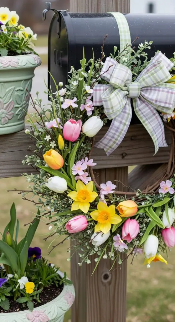 Create simple floral mailbox displays by layering smaller blooms behind larger focal flowers, then adding texture with artificial greenery or small branches. Complement your wreath with matching garden planters positioned nearby to create a cohesive spring display that extends your decorative theme beyond just the mailbox. Finish with weather-resistant spray coating to protect your creation from rain and sun damage while maintaining lively colors.