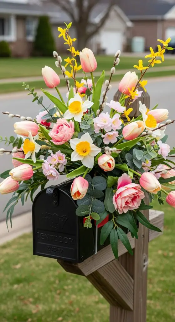Create stunning faux floral arrangements by combining tulips, daffodils, and cherry blossoms with eucalyptus sprigs for texture. Mix seasonal foliage combinations like pussy willows with forsythia branches to achieve authentic spring appeal. Secure arrangements using floral foam inside weatherproof containers, then attach them to your mailbox post with outdoor-rated zip ties for maximum durability and visual impact.