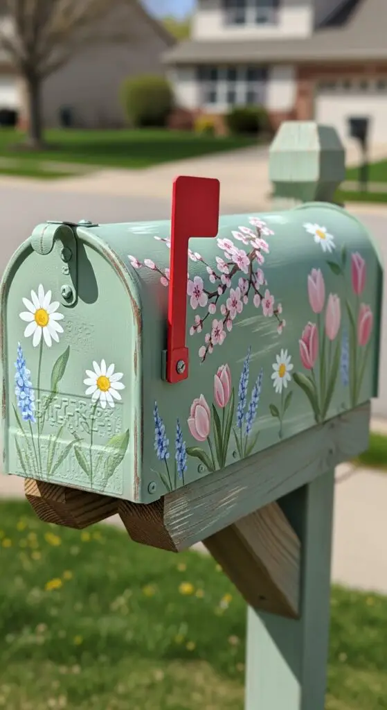 Hand painted floral designs metamorphose ordinary mailboxes into charming focal points. You can paint simple daisies, cherry blossoms, or tulips using basic acrylic paints. Distressed mailbox treatments using sandpaper create vintage appeal by revealing underlying colors. This technique works perfectly with spring themes, giving your mailbox character and timeless charm. For an authentic old-world rustic feel, consider incorporating weathered wood accents or aged metal hardware alongside your painted design.