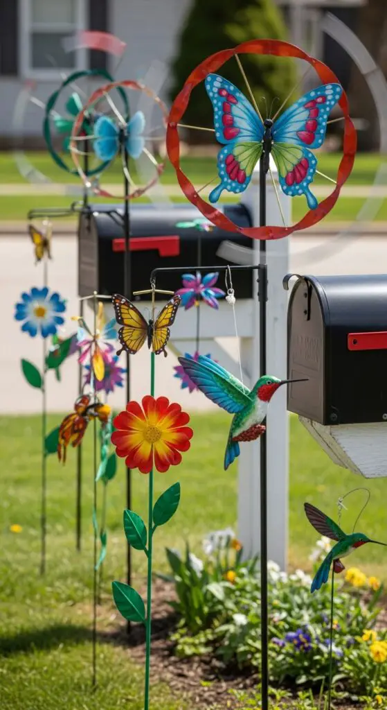 Mount spinners on sturdy posts beside your mailbox or attach smaller versions directly to the post itself. Mesmerizing motion art creates continuous visual interest as pieces rotate and sway with each gentle breeze. Select weather-resistant materials like powder-coated metal or durable plastics that’ll withstand spring storms while maintaining their brilliant colors throughout the season.