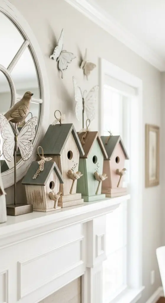 Beyond creating ambiance with candles, incorporating nature-inspired elements brings your spring mantle to life with fanciful charm. I recommend adding perched birdhouses in weathered wood or pastel finishes to create focal points that celebrate renewal.