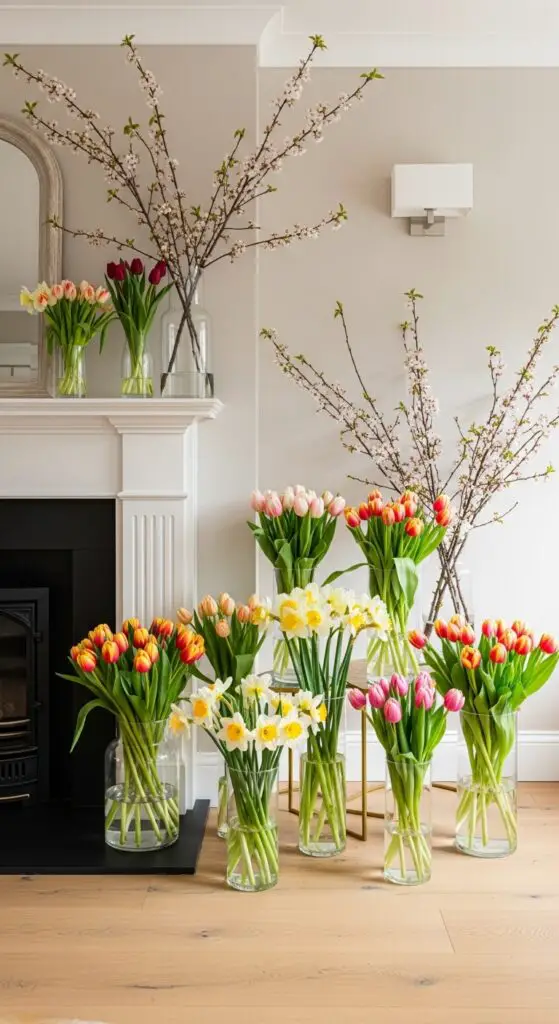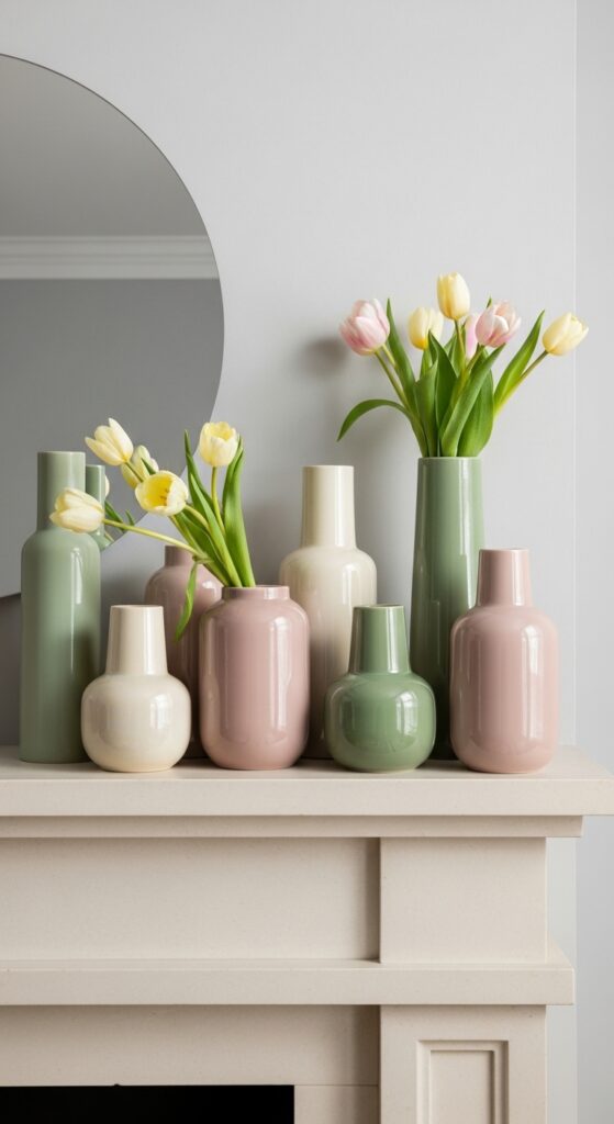 Several colorful vases arranged thoughtfully across your mantle create an instant spring metamorphosis that’s both budget-friendly and visually striking.