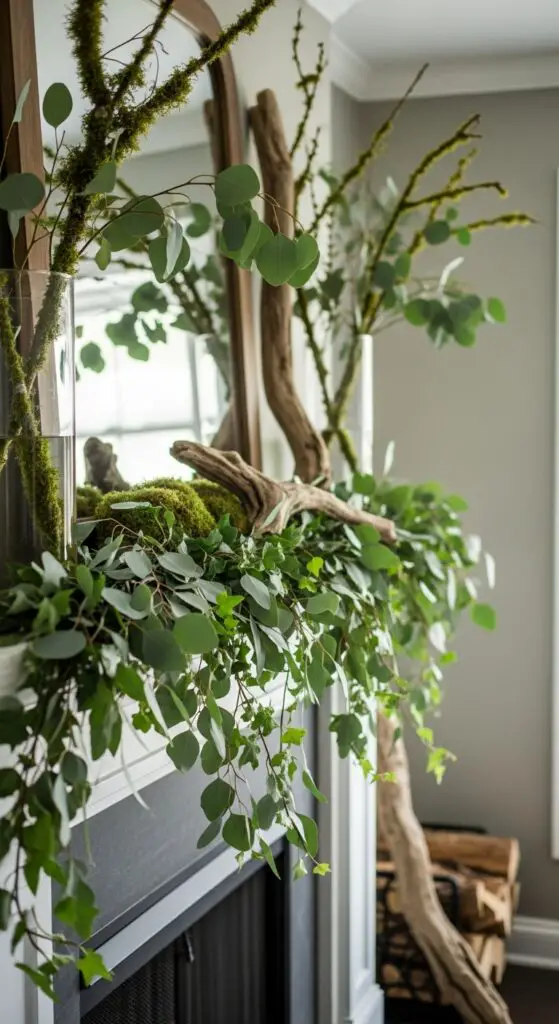 Fresh greenery reinvigorates any mantle into a lush spring sanctuary that captures nature’s effervescent renewal perfectly. I recommend layering eucalyptus garlands with trailing ivy for dimensional texture that flows naturally across your mantle’s length.