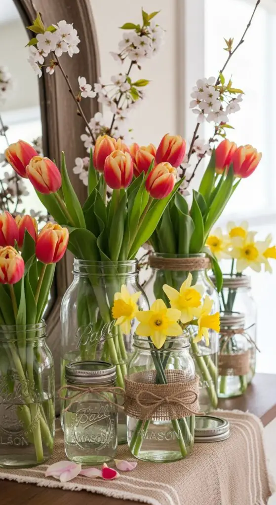 Fill varying jar sizes with tulips, daffodils, or cherry blossoms for variable height variations. Cluster three to five jars across your mantle, incorporating handmade pottery accents between arrangements for textural contrast. These displays work beautifully in themed tablescapes that extend beyond your fireplace.