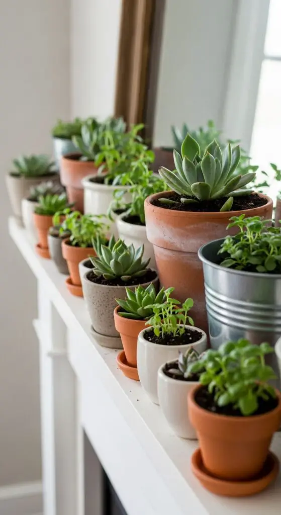 Consider positioning herb garden window box displays near your mantle if you’ve got nearby windows. Basil, mint, and rosemary offer captivating fragrances alongside their lively green foliage. Mix different pot sizes and materials—terra cotta, ceramic, or galvanized metal—to create depth and interest that captures spring’s fresh, natural energy beautifully.