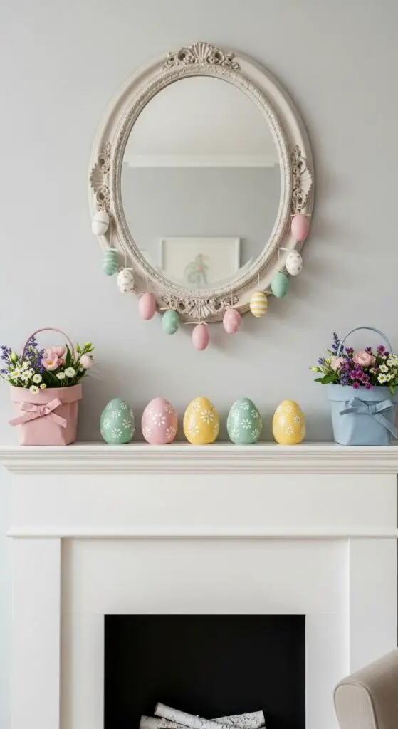 Place pastel eggs with decorative patterns along your mantle’s length, mixing solid colors with delicate floral motifs. Add pastel Easter baskets with fresh blooms as charming focal points on either end. These gentle colors create a soothing backdrop that feels fresh without overwhelming your space, giving you complete creative freedom to express your personal spring style. Consider extending these soft hues into adjacent spaces like your bathroom to create a cohesive spring atmosphere throughout your home.