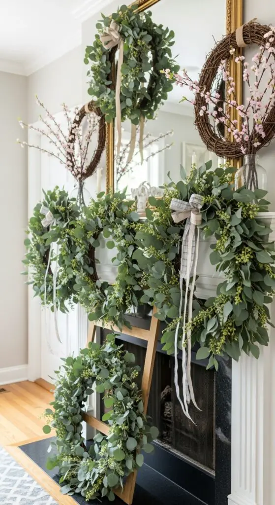 Mount wreaths directly on the wall above your mantle or lean them against mirrors for doubled impact. Mix sizes strategically—pair one large statement wreath with smaller complementary pieces to achieve balanced, professional-looking arrangements.