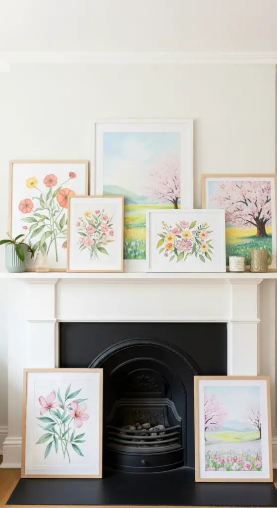 While greenery brings natural beauty to your mantle, spring-themed artwork introduces color, personality, and seasonal charm that alters your space into a curated gallery. I’d recommend mixing different art styles for visual interest.