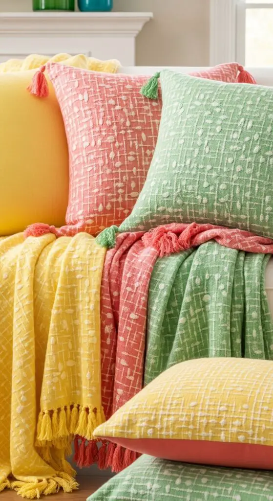 Choose cotton, linen, or lightweight woven materials in captivating yellows, coral pinks, and fresh greens. These lush textures create visual warmth without overwhelming your display.