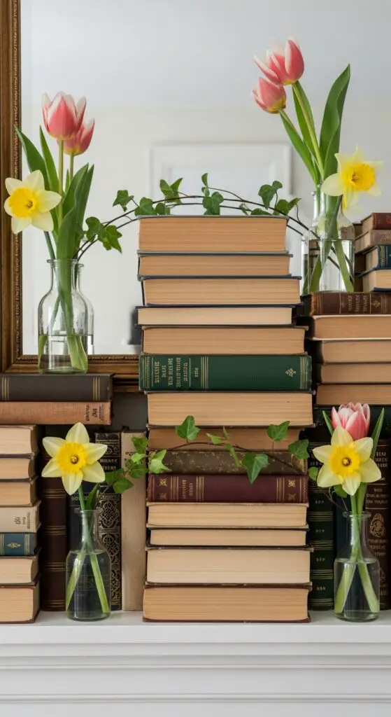 Your antique book collections work beautifully when paired with glass bud vases containing single stems or small bouquets. Layer books by varying heights and colors, then weave ivy or flowering branches throughout the arrangement. This approach creates an effortless, collected-over-time aesthetic that celebrates both literature and spring’s renewal.