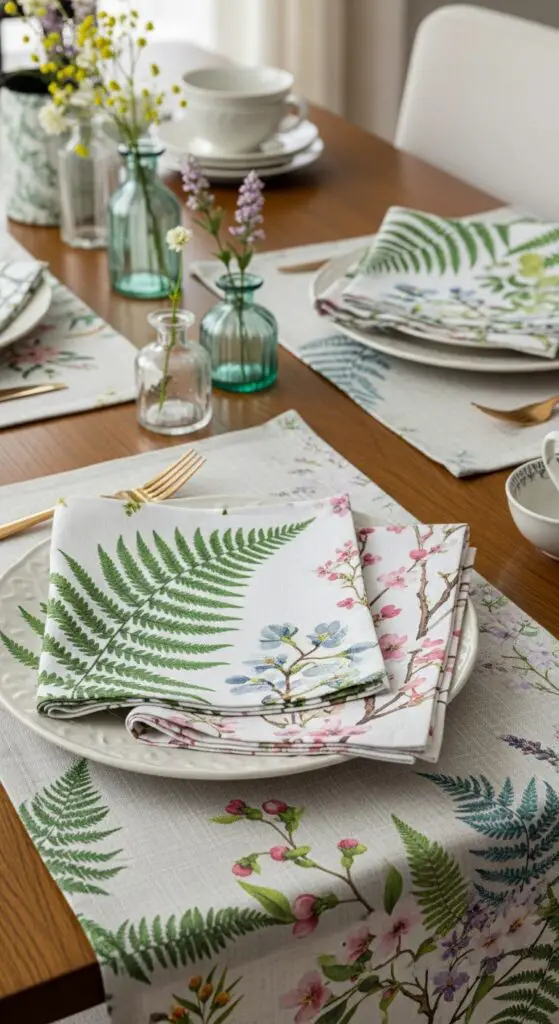 Botanical print napkins and textiles metamorphose ordinary table settings into garden-inspired celebrations that capture spring’s awakening beauty. I recommend layering these nature-themed pieces with textural linen placemats to create dimensional interest.