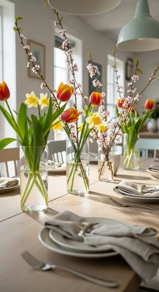 When it comes to creating a graceful spring centerpiece, fresh flowers in simple glass vases offer the perfect balance of refinement and natural beauty. I recommend choosing clear, cylindrical vases that won’t compete with your blooms for attention.