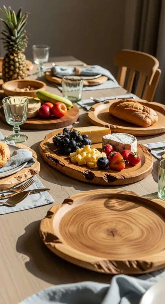 Rustic wood platters create stunning foundations for seasonal fruits, cheese selections, or fresh bread displays. Their irregular edges and visible grain patterns add authentic character that can’t be replicated.