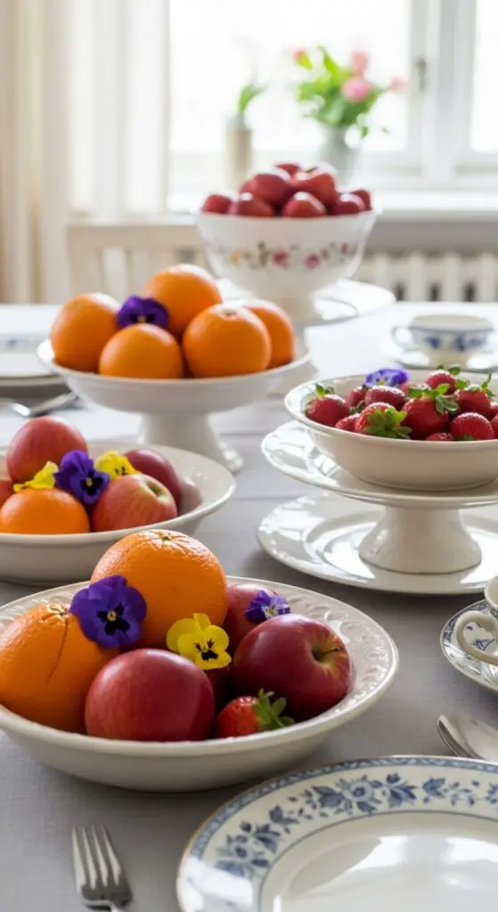 Fresh seasonal fruits create stunning centerpieces that naturally complement your vintage ceramic dinnerware while adding lively colors and organic textures to your spring table setting.