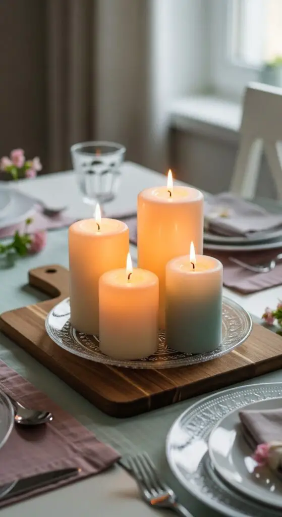 While overhead lighting can feel harsh during intimate spring dinners, pillar candles create the warm, inviting glow that converts your table into a cozy retreat. I love grouping three different heights together for visual interest—try 4-inch, 6-inch, and 8-inch pillars in cream or soft pastels. Place them on wooden cutting boards or glass plates for safety and style.