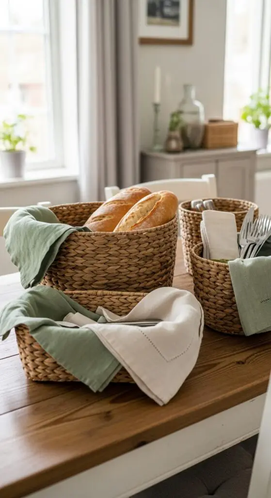 For bread basket display, choose medium-sized woven pieces with shallow sides that showcase your favorite loaves beautifully. Line them with linen napkins in soft spring colors like sage or cream for an elevated touch.
