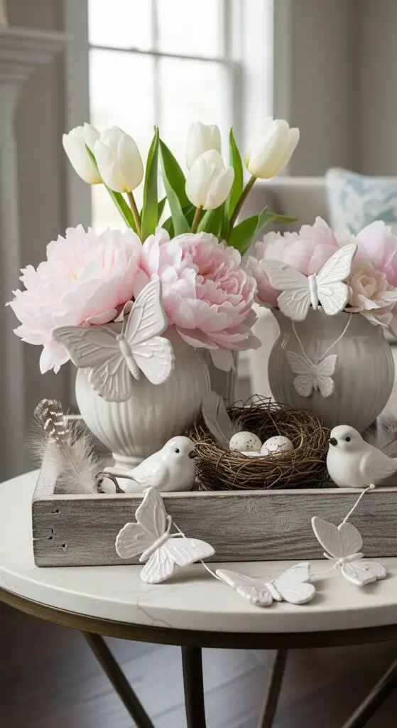 Start with delicate ceramic butterflies positioned among feminine floral accents like soft pink peonies or white tulips. Add miniature playful bird nests filled with speckled eggs for authentic charm. Layer feathers, small bird figurines, and butterfly garlands across weathered wood or vintage silver trays. These natural motifs create movement and life, making your display feel like springtime captured indoors with effortless sophistication.
