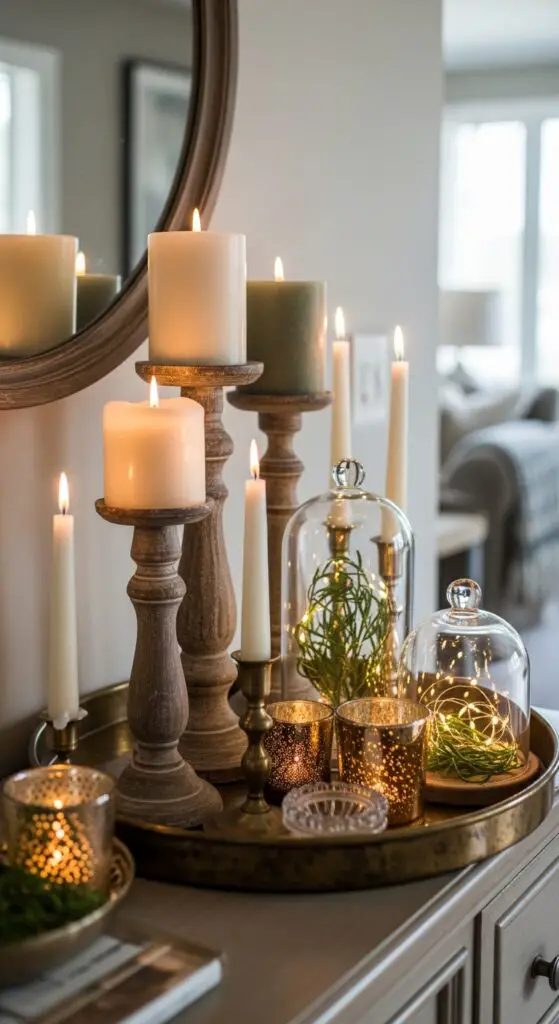 I recommend mixing heights by combining tall tapers with votive clusters for variable visual interest. Mixed metallic finishes like brass and copper add sophisticated warmth to your arrangement. Position battery-operated fairy lights beneath glass cloches or around fresh greenery for subtle illumination.