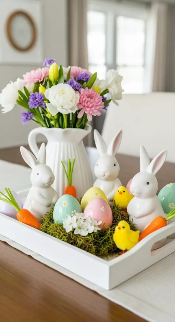 Layer these elements with seasonal touches like mini carrots, yellow chicks, or spring greenery. Use soft pastels as your color palette, mixing whites, pinks, yellows, and mint greens for an authentic springtime feel that celebrates renewal.
