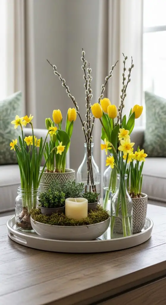 These lighting combinations alter ordinary trays into enchanting displays that celebrate spring’s renewal while providing cozy evening atmosphere.