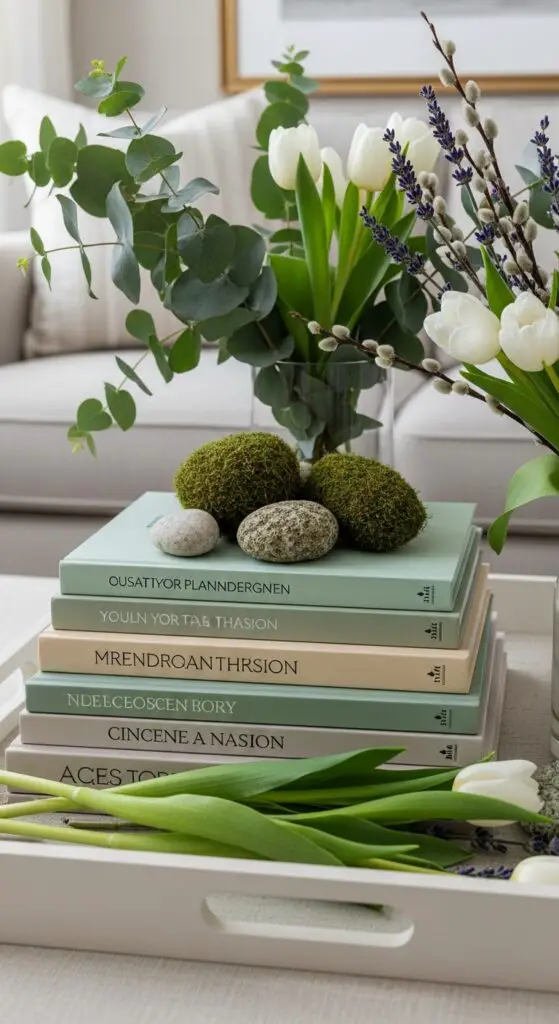 Three simple elements refine any spring tray into a sophisticated display: carefully stacked books, fresh botanicals, and thoughtful layering techniques. I’ll stack two or three books horizontally, choosing covers in soft greens, creams, or pastels that complement spring’s palette.