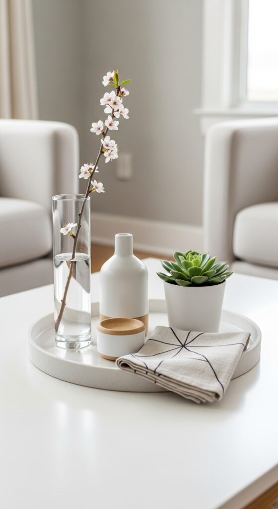 Since spring’s natural beauty speaks volumes on its own, minimalist tray styling allows each carefully chosen element to shine without overwhelming visual clutter. I recommend selecting three to five items maximum, focusing on clean geometric forms like cylindrical vases or rectangular planters.