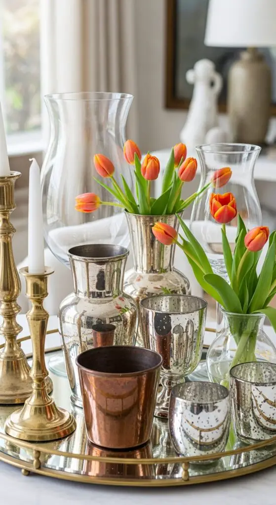 When you combine different metallic finishes with glass elements, you create sophisticated spring displays that catch and reflect natural light beautifully. I love mixing brass candlesticks with silver vases and copper planters on mirrored trays for maximum visual impact. Mercury glass accents add vintage charm while amplifying brightness throughout your arrangement.