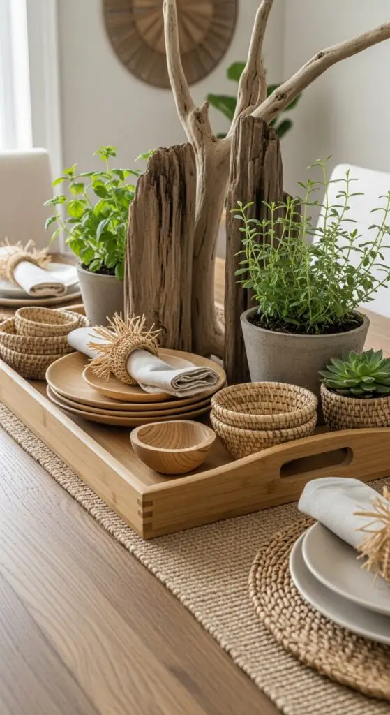 Layer different wood tones by mixing bamboo serving pieces with reclaimed wood accents. Add raffia accents through napkin rings, small bowls, or wrapped planters to enhance the textural contrast. Complete your display with woven placemats or jute table runners underneath your tray. Soft tones naturally complement the wood elements while maintaining the peaceful, nature-inspired aesthetic that defines authentic spring decorating. This approach creates a grounding foundation that lets you welcome spring’s natural beauty without overwhelming your space.