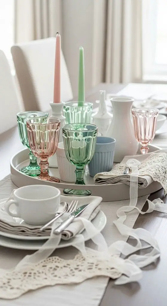 Start with a neutral base tray, then layer pastel glassware accents in blush pink, sage green, and powder blue. Add soft fabric textures through linen napkins or cotton runners that complement your color scheme. Mix different shades within the same pastel family for depth without overwhelming the eye. Include white or cream elements to balance the colors and create visual breathing room for an effortlessly refined spring arrangement. Incorporating light textures like delicate lace doilies or sheer ribbons enhances the soft aesthetic while maintaining the seasonal freshness.
