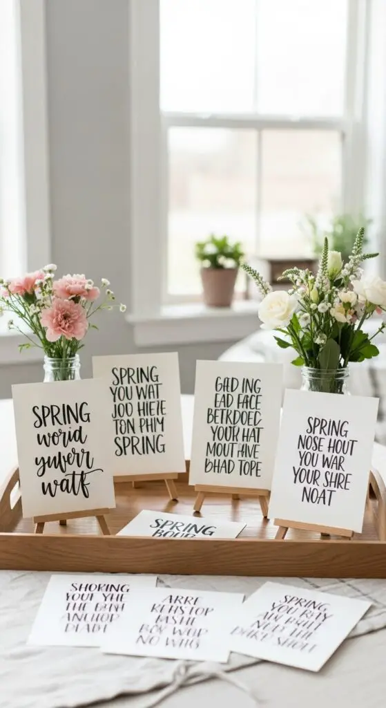 Create custom typography by printing favorite spring quotes on cardstock, then lean them against small easels or images. Mix different font sizes and styles for visual interest. Hand lettered quotes work beautifully alongside fresh flowers and greenery.