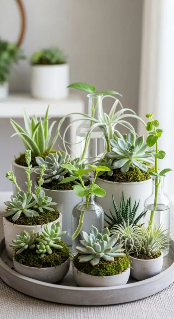 Start by selecting varied succulent textures and heights. Place moss covered rocks around smaller plants to create natural-looking scenery. Add water filled vases with single stems or air plants for visual interest. Group odd numbers of elements together, mixing different container sizes and materials to achieve balanced compositions that reflect your personal style perfectly. These fresh arrangements help transform any space with vibrant seasonal energy that captures the essence of spring’s awakening.
