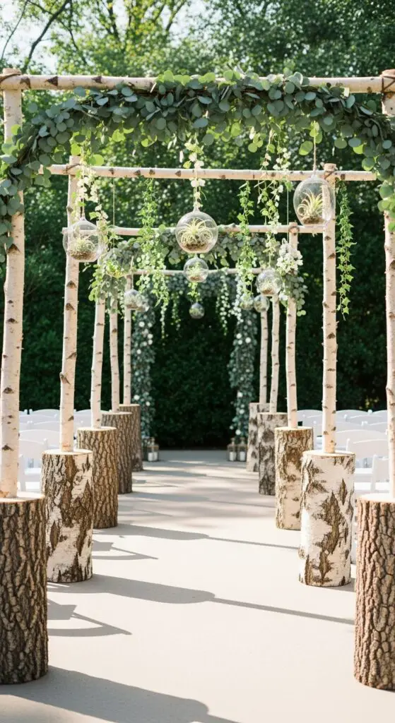 Add birch branch archway accents at key focal points, incorporating suspended eucalyptus garlands and trailing ivy. Hang glass terrariums filled with air plants from crossbeams, creating floating garden moments. This layered approach gives you complete creative freedom while establishing breathtaking ceremony ambiance.