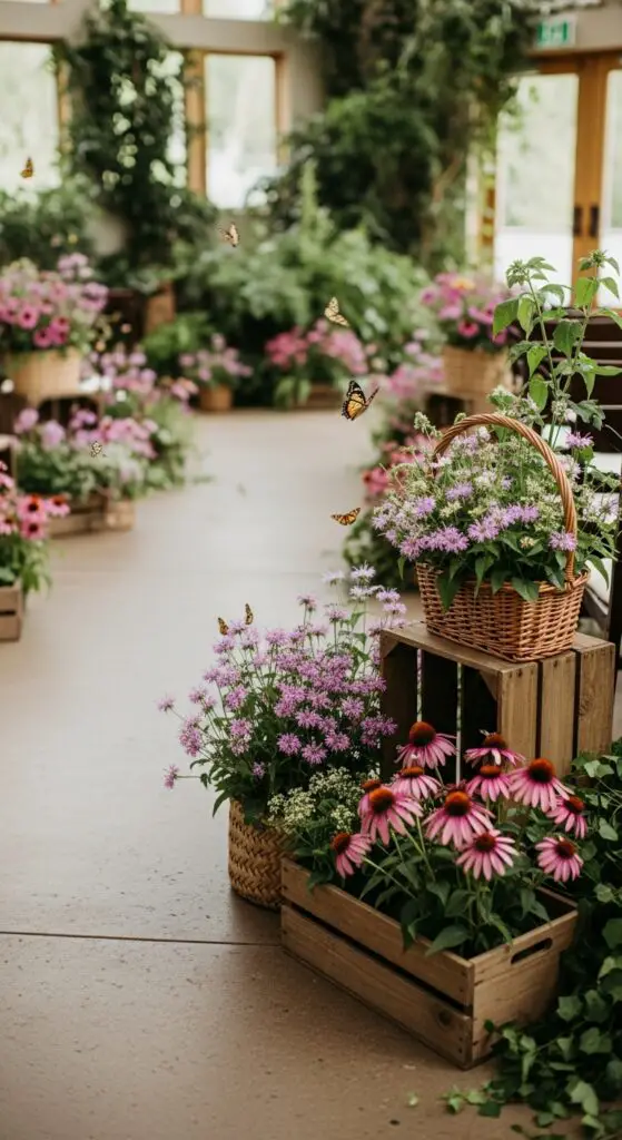 Choose indigenous wildflowers like violet wood sorrel, wild bergamot, and native coneflowers that naturally support diverse butterfly species in your region. Plant these selections in rustic wooden boxes or woven baskets positioned along your ceremony path.