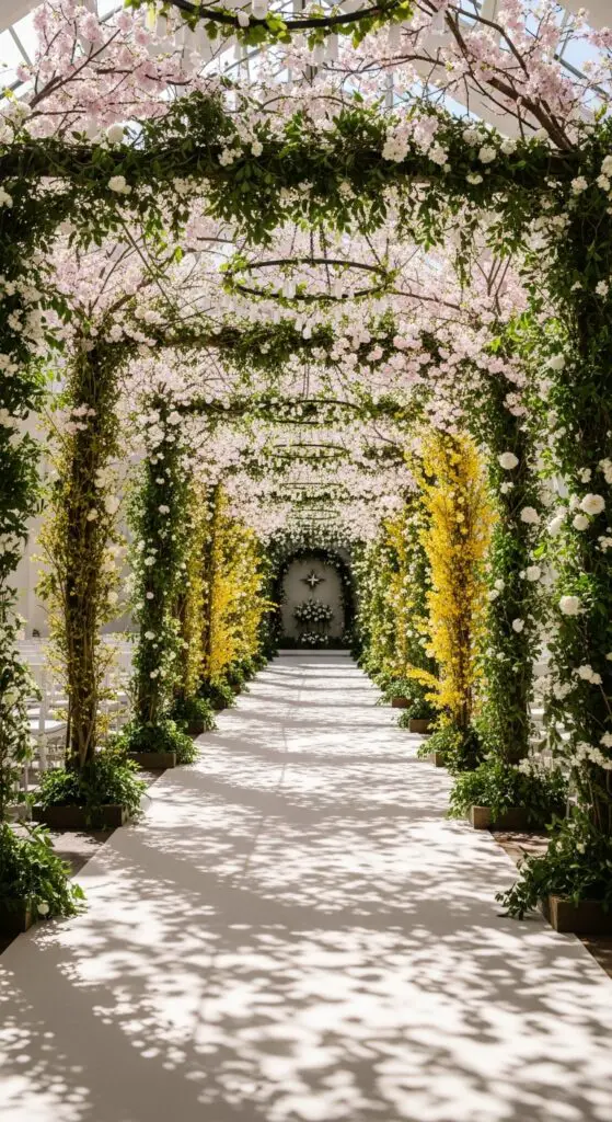 The dappled sunlight filtering through petals creates magical shadows, altering your processional into an unforgettable walk through nature’s own chapel.