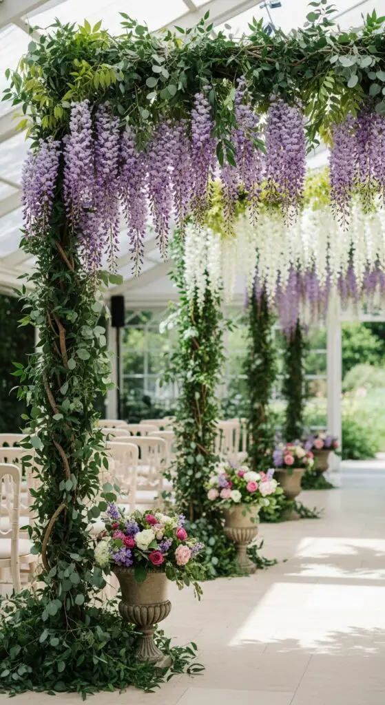 Position tall floral stands every six feet, then drape artificial or fresh wisteria clusters downward for stunning visual flow. This draping floral decor works beautifully for outdoor venues with existing arbors or indoor spaces with ceiling suspension points. You’ll achieve maximum impact by layering different purple wisteria shades with complementary white blooms throughout your cascading design. Enhance the magical atmosphere by incorporating decorative planters filled with seasonal spring blooms at the base of each installation.