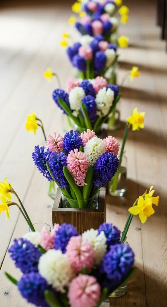Position mixed hyacinth bouquets in rustic wooden boxes every third row for balanced visual impact. Alternate purple, pink, and white varieties to create depth and movement. Add single stem daffodil accents in simple glass vases between larger arrangements for delicate contrast. This layered approach guarantees guests experience bursts of color and sweet fragrance throughout your walk down the aisle.
