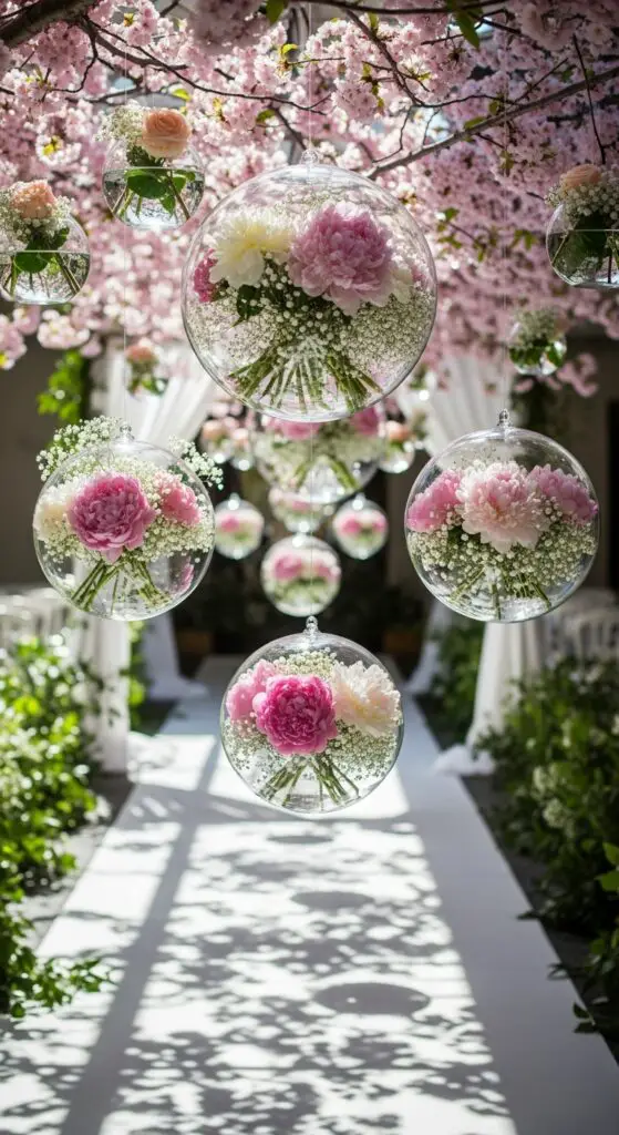 Positioning suspended crystal orbs at varying heights above your aisle for lively visual interest. Fill clear glass spheres with fresh peonies, cherry blossoms, or baby’s breath for authentic spring beauty. Flower filled hanging vases work perfectly alongside these installations, creating layered textures throughout your ceremony space.