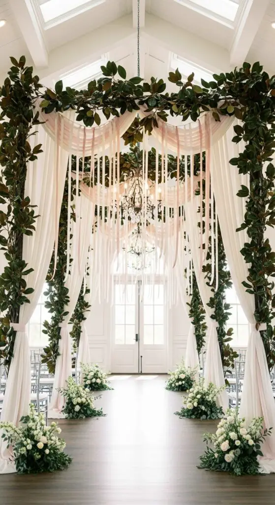 Towering magnolia branch archways alter your ceremony space into a sophisticated southern sanctuary that captures spring’s most beautiful blooms. I’ll show you how to create these stunning focal points that give you complete creative control over your wedding aesthetic.