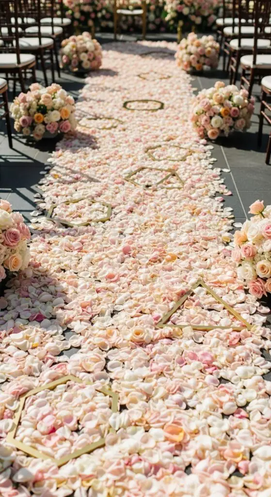 When you’re planning a spring garden ceremony, cherry blossom petals create the most enchanting aisle pathway that guests will remember for years. I recommend scattering fresh pink and white petals generously along your walkway for that dreamy, romantic effect you’re after.