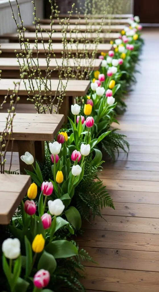 For couples seeking charming countryside elegance, tulip-lined walkways paired with rustic wooden elements create an enchanting spring ceremony setting that’s both sophisticated and naturally beautiful.