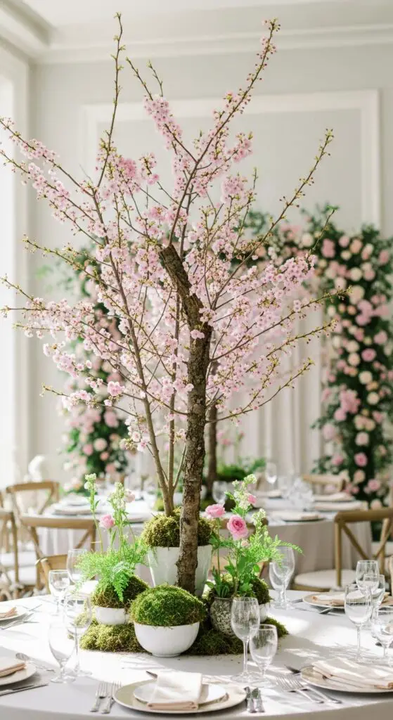 Cherry blossom branches create stunning centerpieces that bring spring’s most iconic blooms directly to your wedding tables. I recommend placing these delicate branches in moss filled vessels for an organic, garden-inspired foundation that complements the natural beauty.