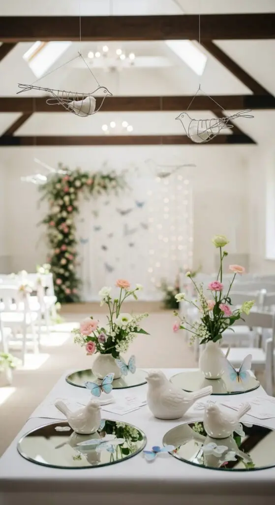 Consider minimalist bird displays using wire sculptures or paper cutouts suspended from ceiling beams. You can scatter butterfly decals across mirror centerpieces or attach them to escort card displays. Place ceramic bird figurines among floral arrangements for subtle whimsy.