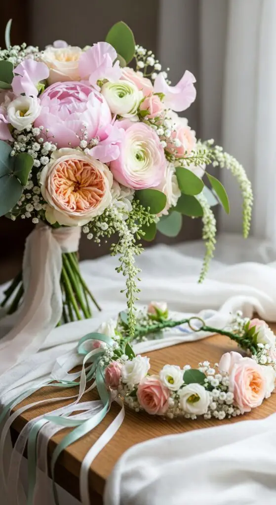 When choosing spring flowers for your crown and bouquet, you’ll want to select blooms that embody the season’s fresh, romantic spirit while complementing your overall wedding aesthetic. Consider delicate peonies, sweet peas, and ranunculus for soft texture and dreamy colors.