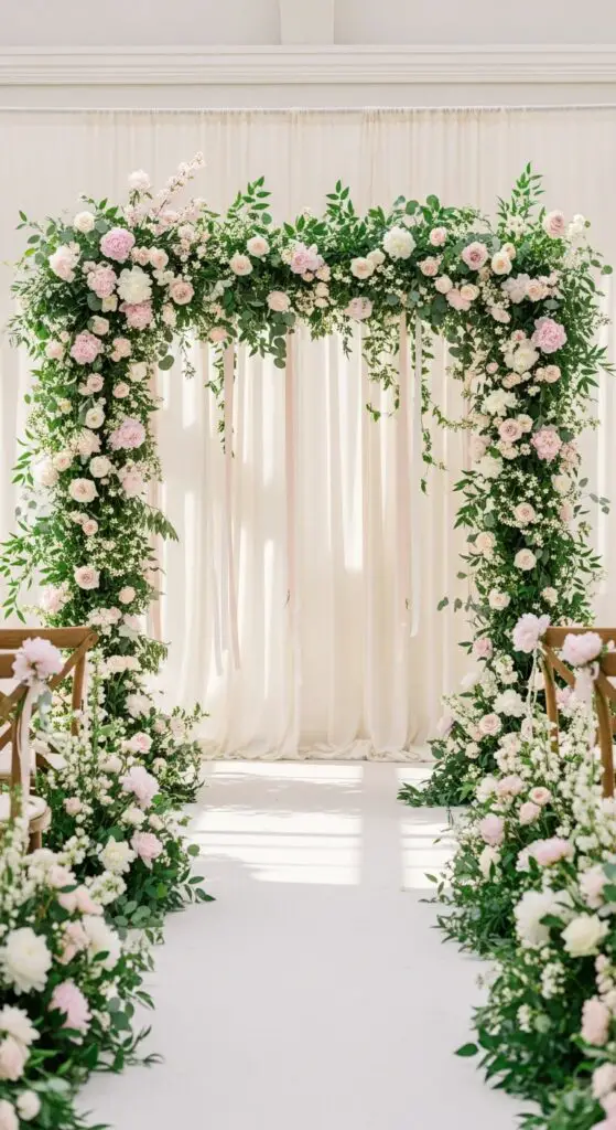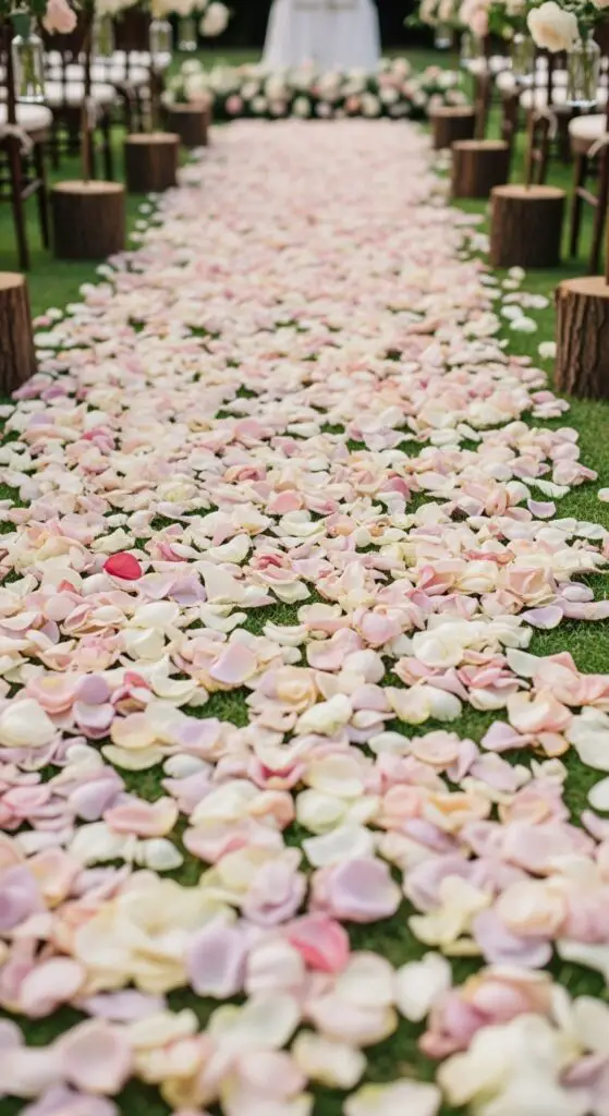 Choose rose petal accents in soft pastels like blush pink, cream, or lavender for timeless elegance. Scatter petals densely at your altar area, then gradually thin them toward the entrance for visual depth. Mix different petal sizes and coordinate colors with your bouquet.