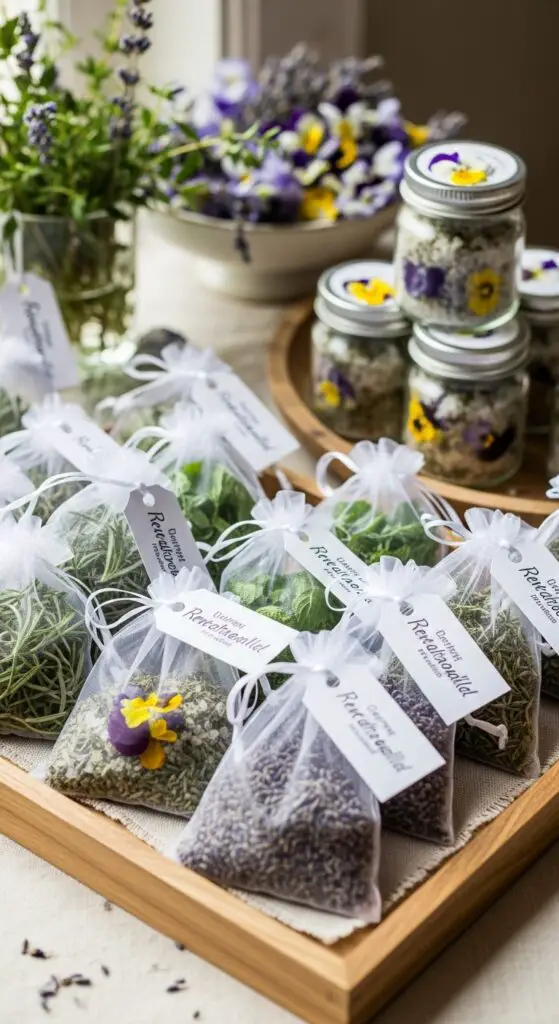 Consider adding edible flowers such as violets or pansies to create visually stunning herb salt blends. These natural favors connect guests to your celebration’s seasonal essence while providing practical items they’ll actually use in their kitchens, making your wedding truly unforgettable.