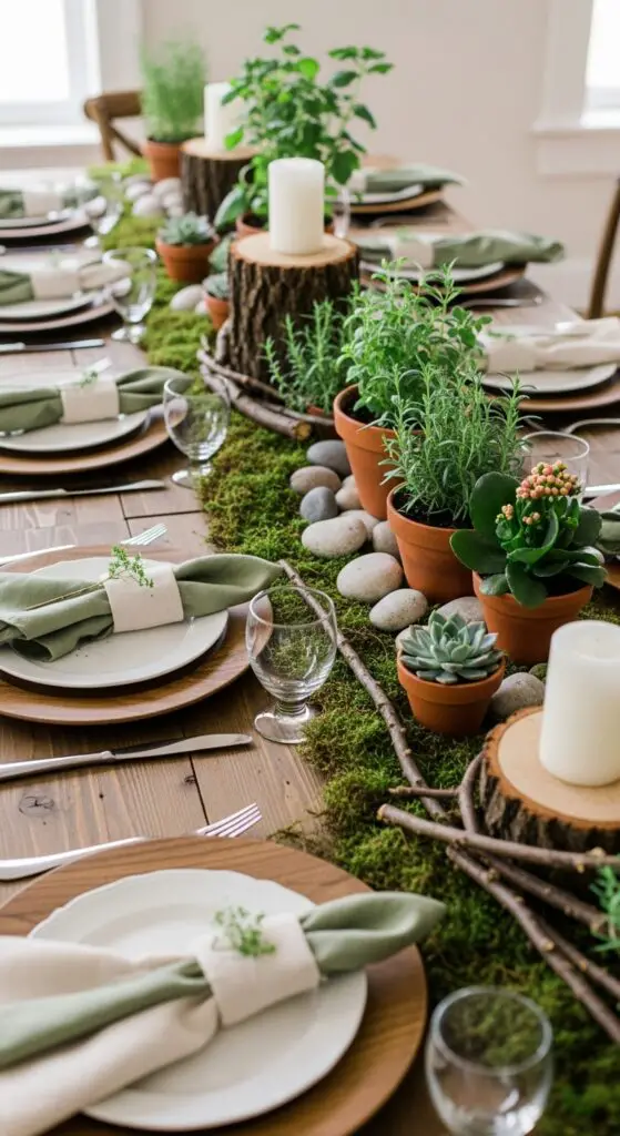 Start with wooden chargers and linen napkins in earth tones like sage green or cream. Add potted herbs, succulents, and moss runners down table centers. These organic tablescapes create depth and texture while guests enjoy fresh scents throughout dinner.