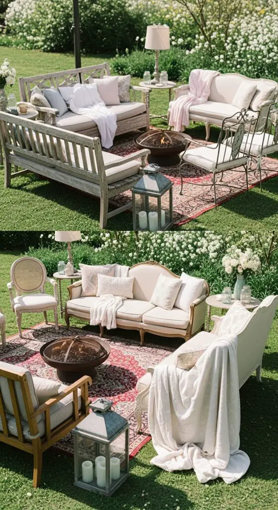 Add cozy firepits surrounded by vintage Persian rugs for warmth and ambiance. Incorporate distressed lanterns, mason jar lighting, and galvanized metal accents throughout each vignette. Position these spaces strategically around your venue to encourage natural conversation flow while maintaining that dreamy spring atmosphere you’ve carefully crafted.