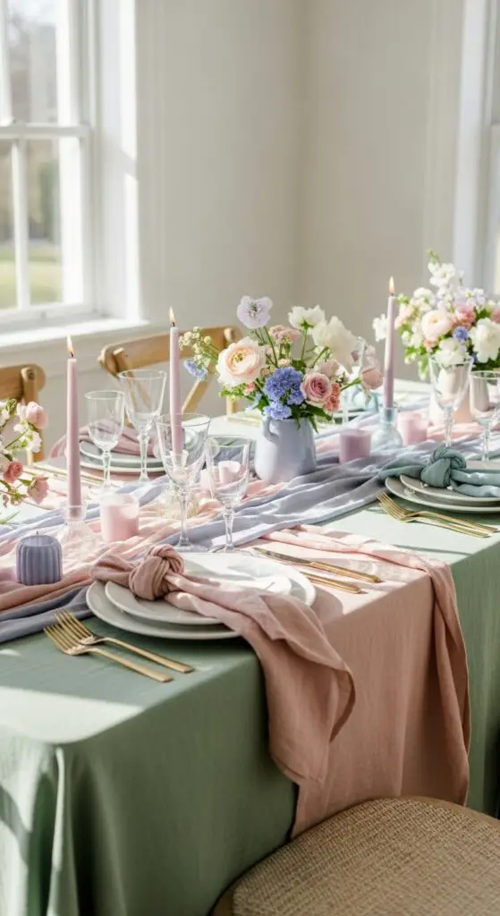 These soft hues work beautifully on refined table linens, creating sophisticated tablescapes that don’t overwhelm your space. You’ll find pastel color palettes naturally enhance natural lighting while maintaining that dreamy atmosphere you’re seeking.