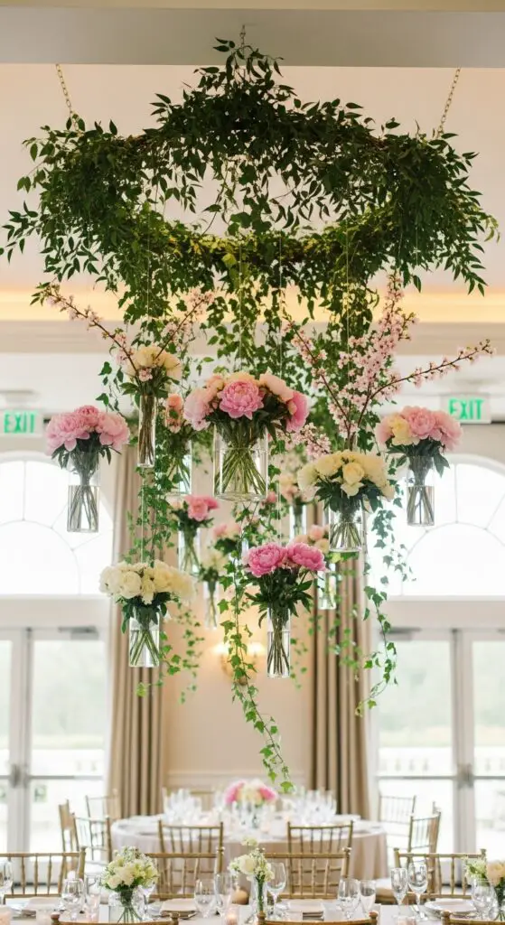 I recommend installing hanging greenery installations at varying heights to add visual depth and movement. Choose suspended glass containers filled with fresh blooms like peonies, roses, or cherry blossoms for an ethereal effect. You’ll want to secure these installations above key areas like your altar, dance floor, or reception tables.