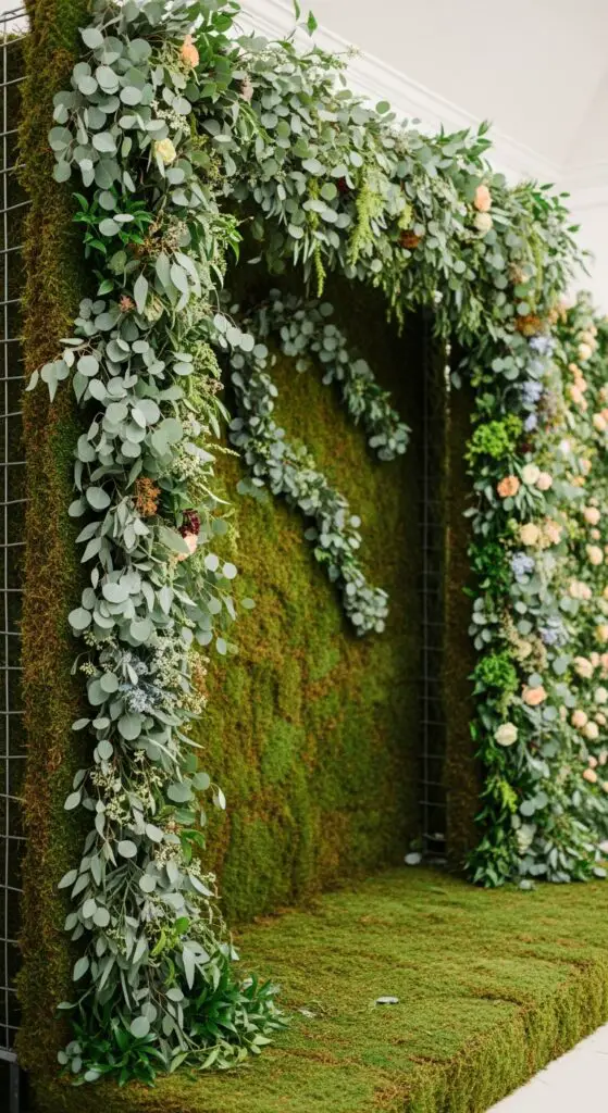 Living floral walls offer another breathtaking option that’ll convert any bland backdrop. Choose fresh eucalyptus, ferns, and seasonal blooms arranged on wire frameworks. You can rent these installations or DIY smaller versions using chicken wire and water tubes for lasting freshness throughout your celebration.